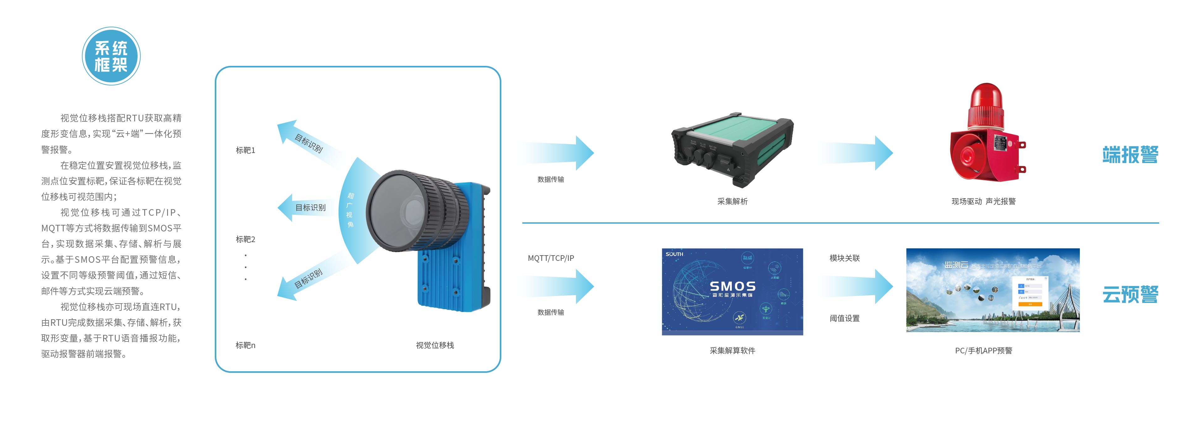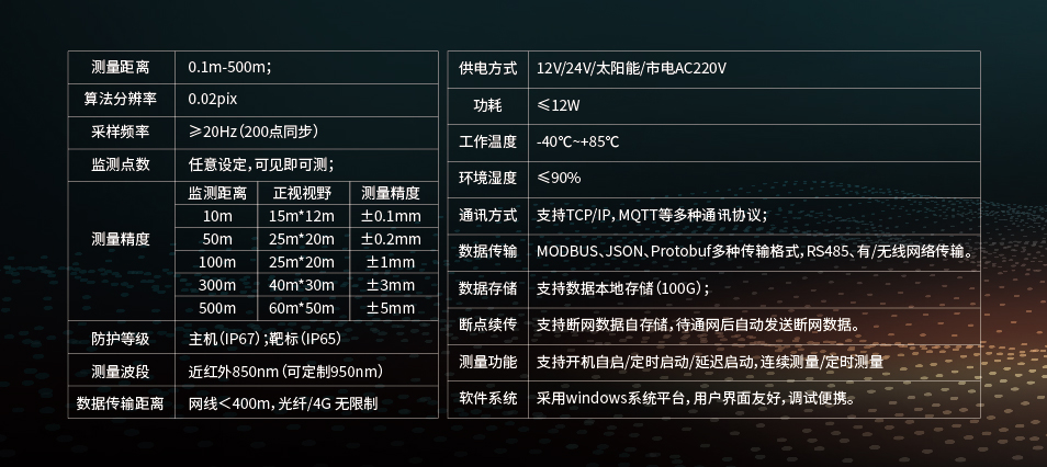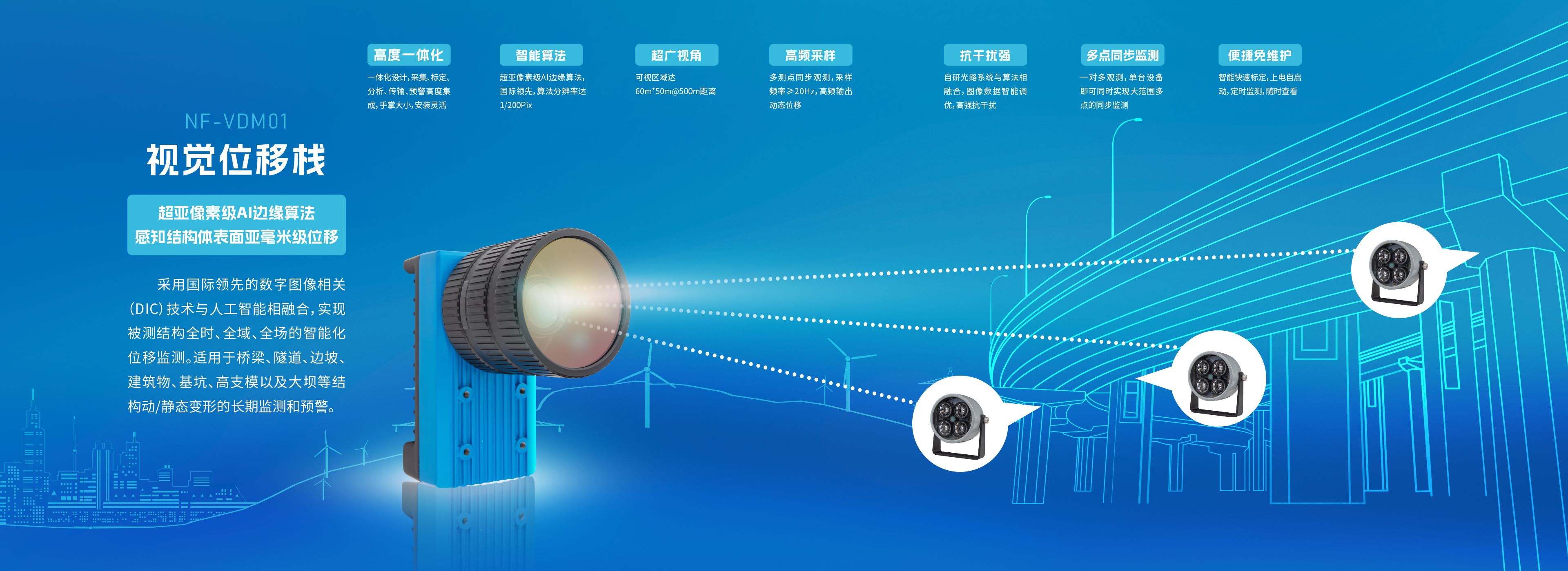 采用國(guó)際領(lǐng)先的數(shù)字圖像相關(guān)(DIC)技術(shù)與人工智能相融合,實(shí)現(xiàn)被測(cè)結(jié)構(gòu)全時(shí)、全域、全場(chǎng)的智能化位移監(jiān)測(cè)。適用于橋梁、隧道、邊坡、建筑物、基坑、高支模以及大壩等結(jié)構(gòu)動(dòng)/靜態(tài)變形的長(zhǎng)期監(jiān)測(cè)和預(yù)警。